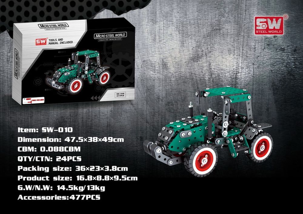 Конструктор SW-010 металл, трактор, инструм, 477дет, в коробке. Размер - 36,5-23,5-4см, Материал - метал + пластмаса, Тип упаковки - коробка.