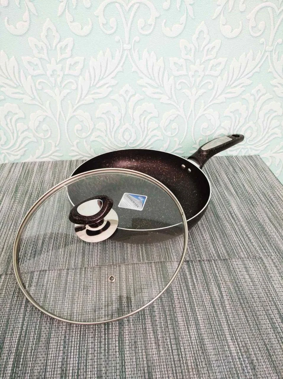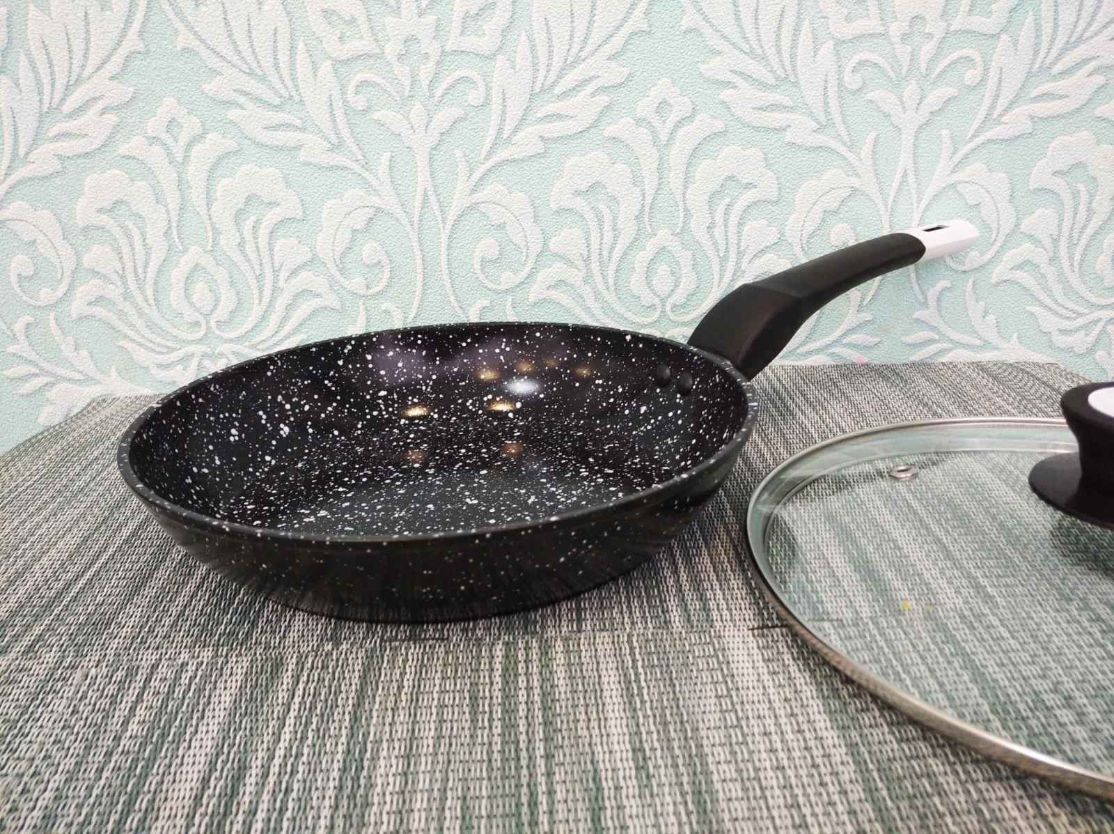 Сковорода с мраморным покрытием в диаметре 24 см, удобна в использовании за счет покрытия позволяющего жарить без всяких проблем