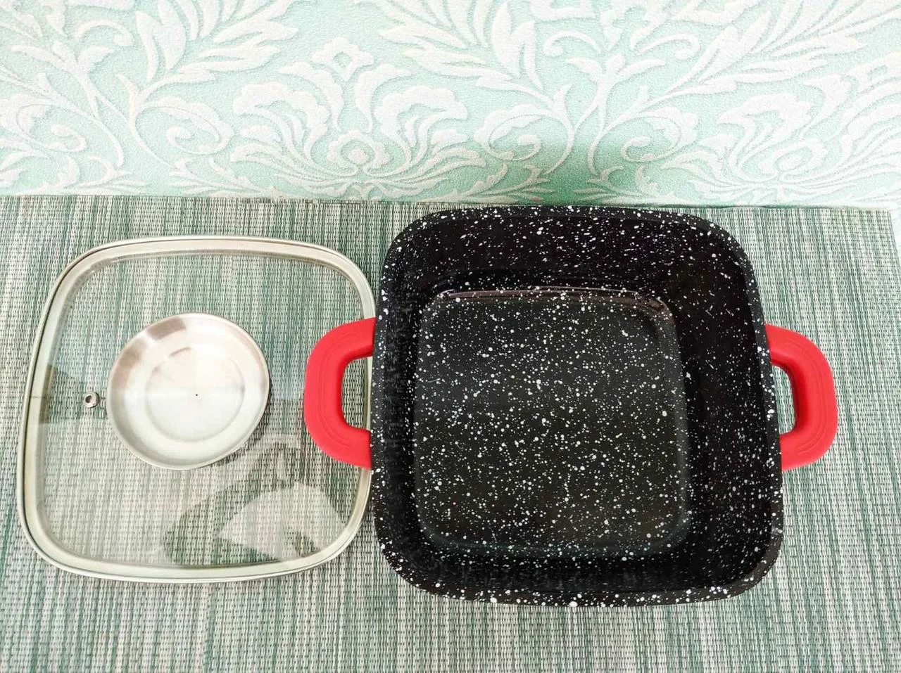 Кастрюля изготовлена из высококачественного литого алюминия, покрытого специальным антипригарным мраморным покрытием
