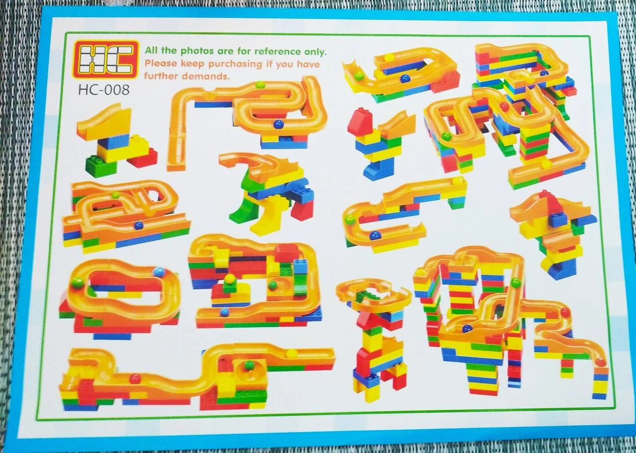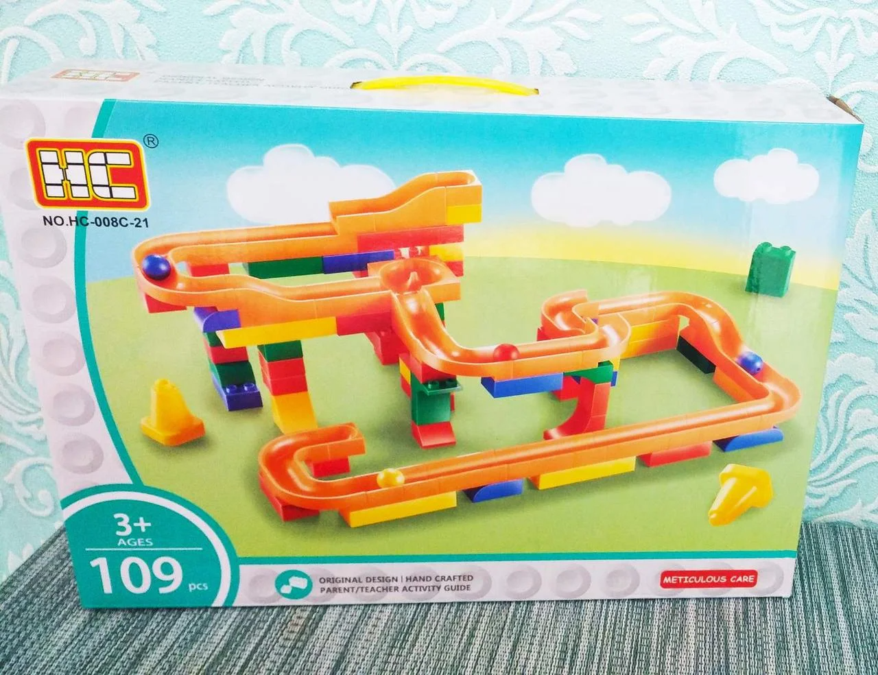 В набор входят детали для сборки горки-трека с крутыми спусками и виражами, шарик.