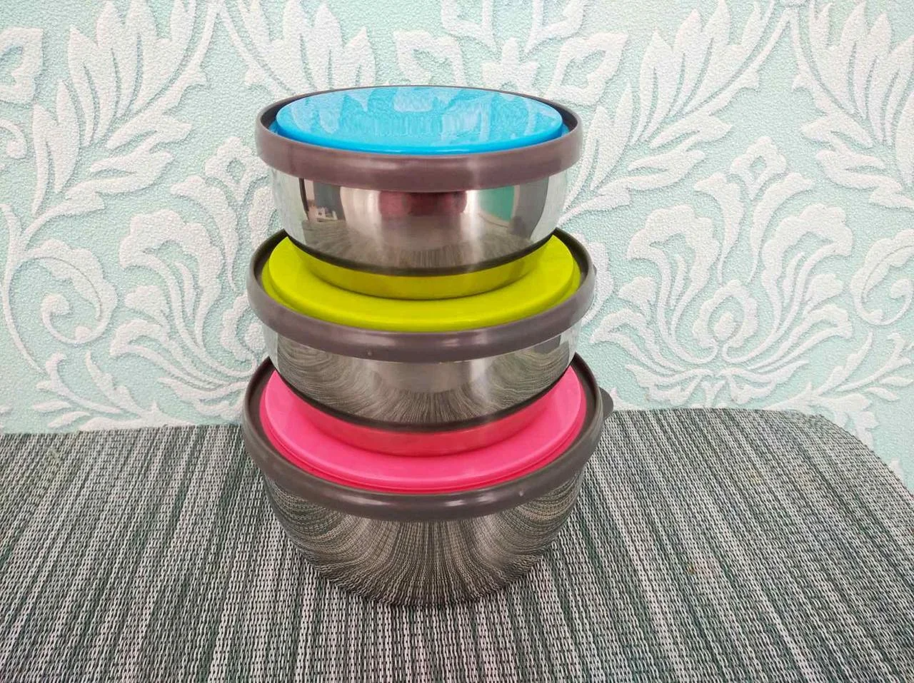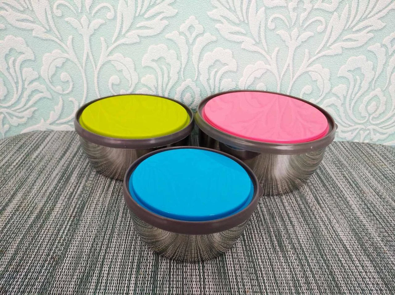 Набор состоит из 3 пищевых контейнеров, изготовленных из нержавеющей стали с яркими пластиковыми крышками. Материалы безвредны для здоровья, не изменяют вкус и запах пищи, выдерживают воздействие высоких температур. Можно использовать для хранения различных продуктов (овощей, фруктов, конфет, печенья), а также для хранения приготовленных блюд (салатов, соусов, мясных блюд, супов и др.) в горячем и холодном виде.