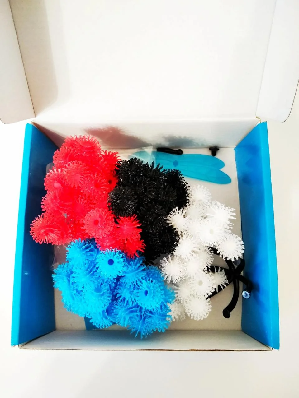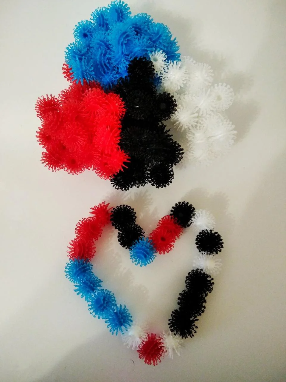Детали конструктора – это шарики ярких цветов, очень пластичные, без запаха, при сжатии сохраняют свою первоначальную форму.