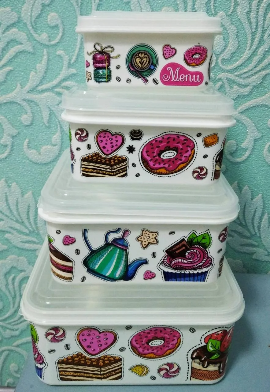 в набор входят 4 контейнера-судочка с крышками разного размера
