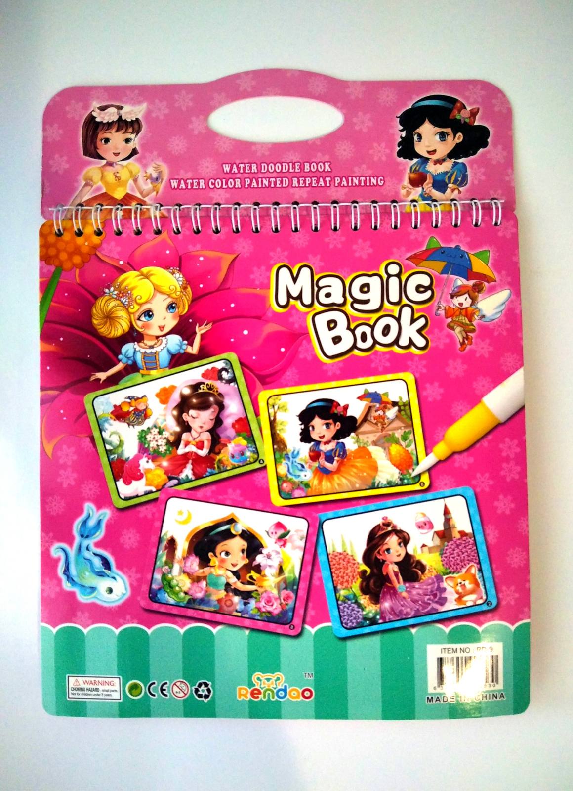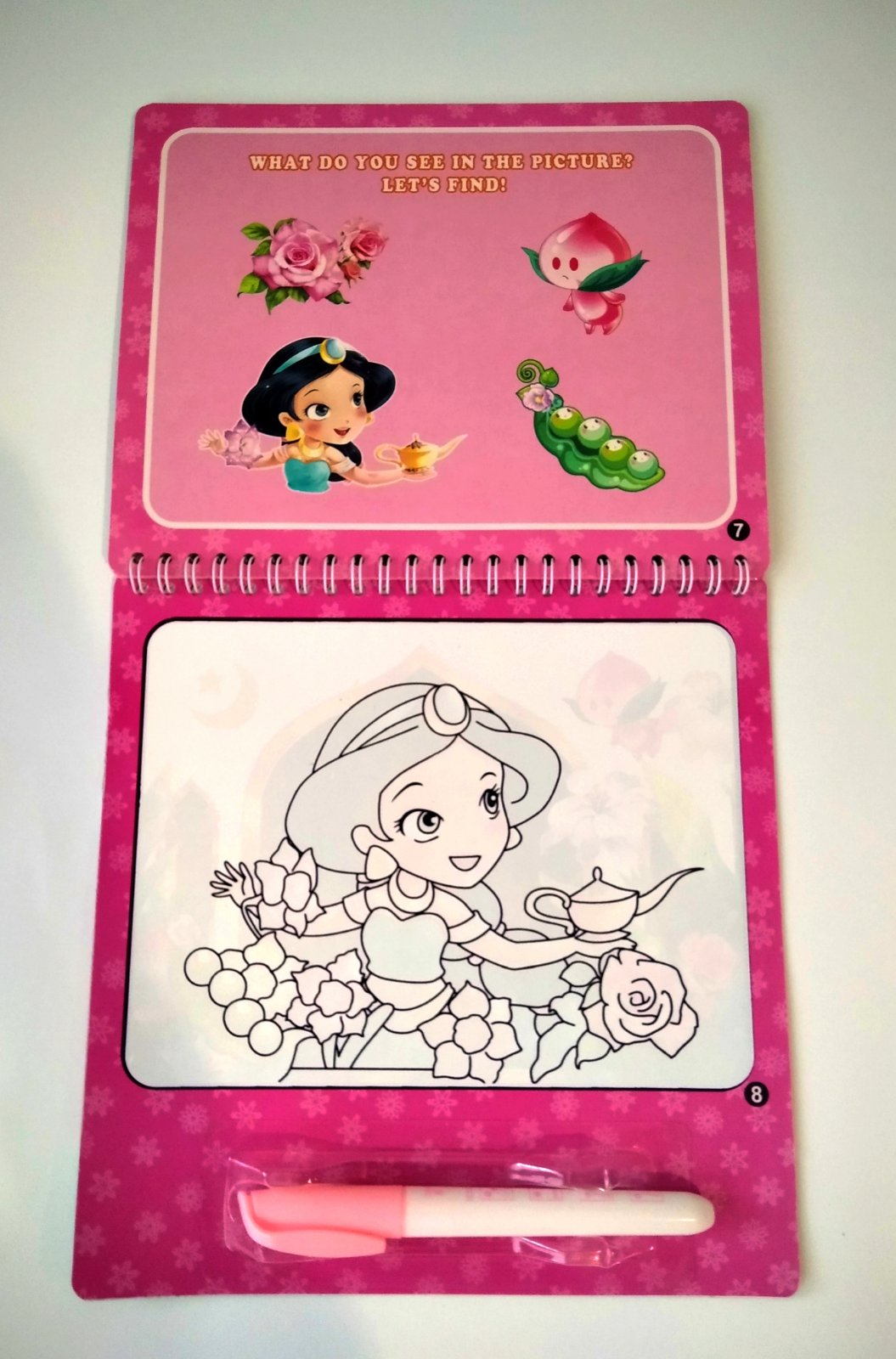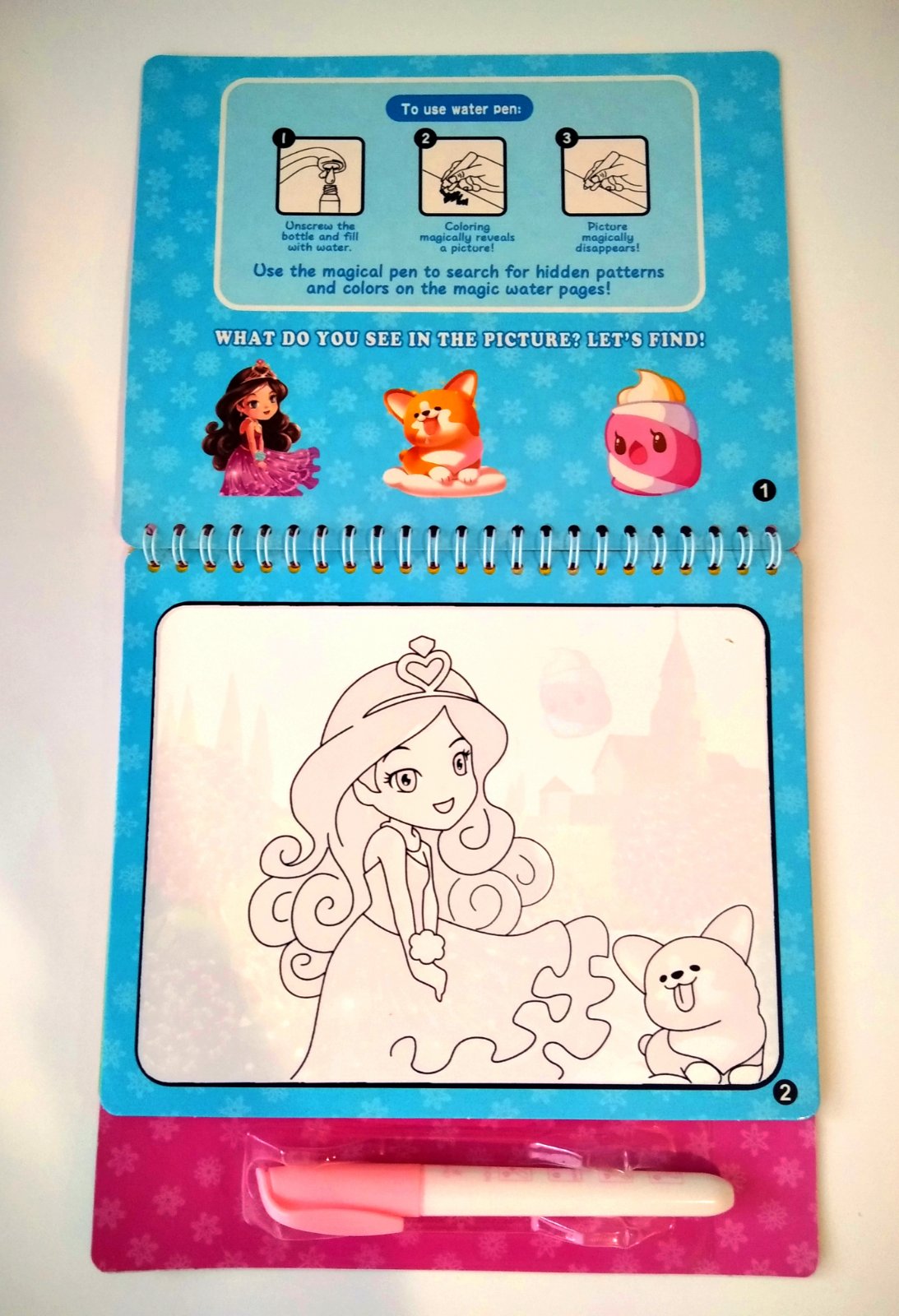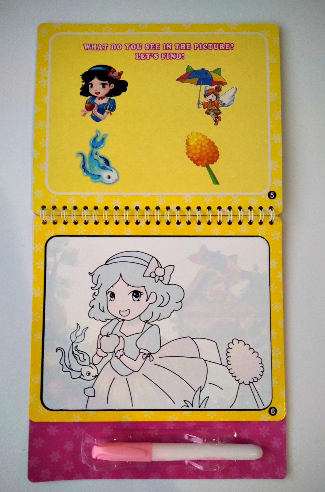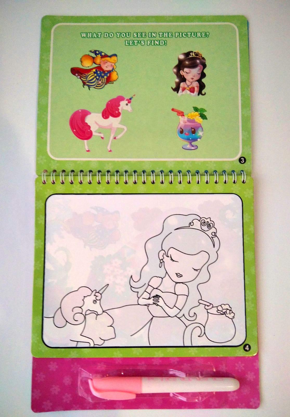 В комплект входит непосредственно водная раскраска и специальный маркер, в который необходимо заливать воду. Когда ребенок начнет раскрашивать черно-белые картинки — будут проявляться цветные изображения. Процесс способствует развитию мелкой моторики рук и координации движений, а также фантазии.