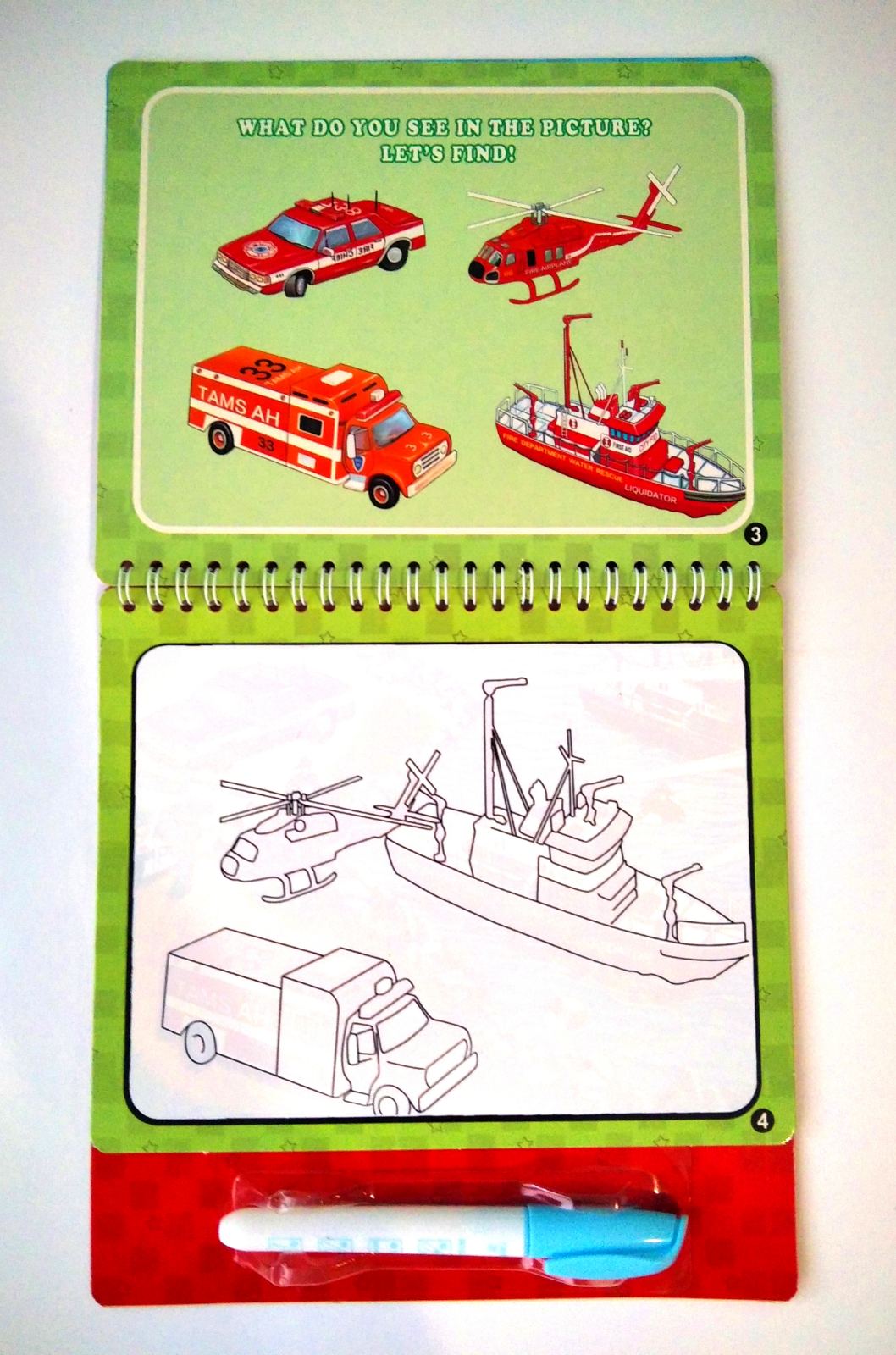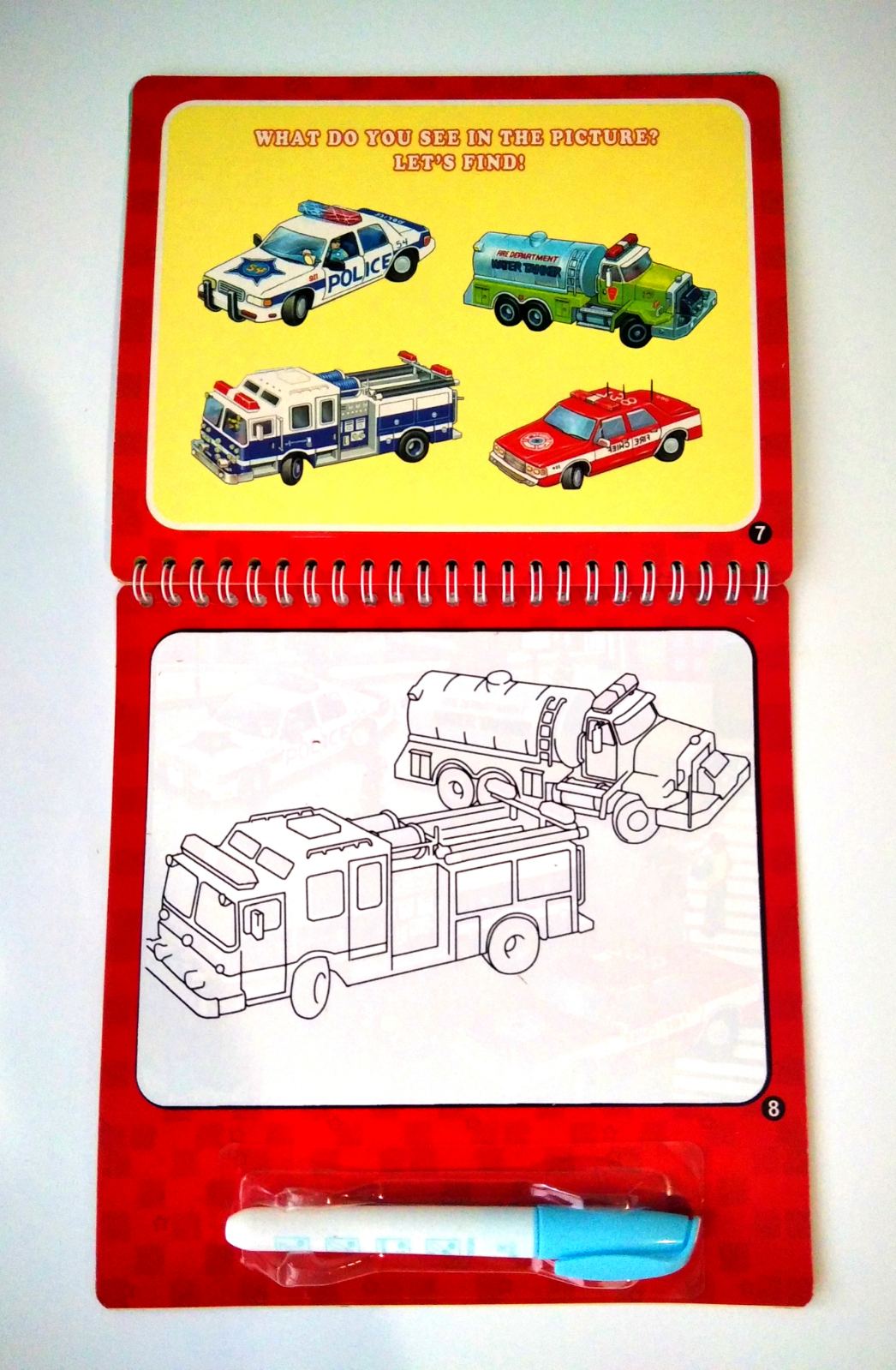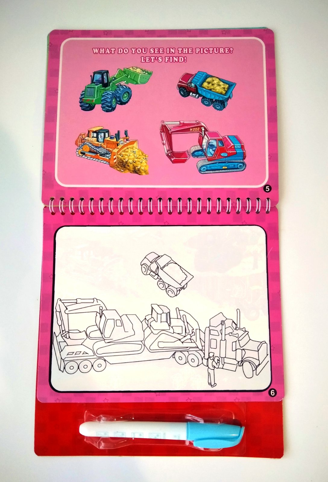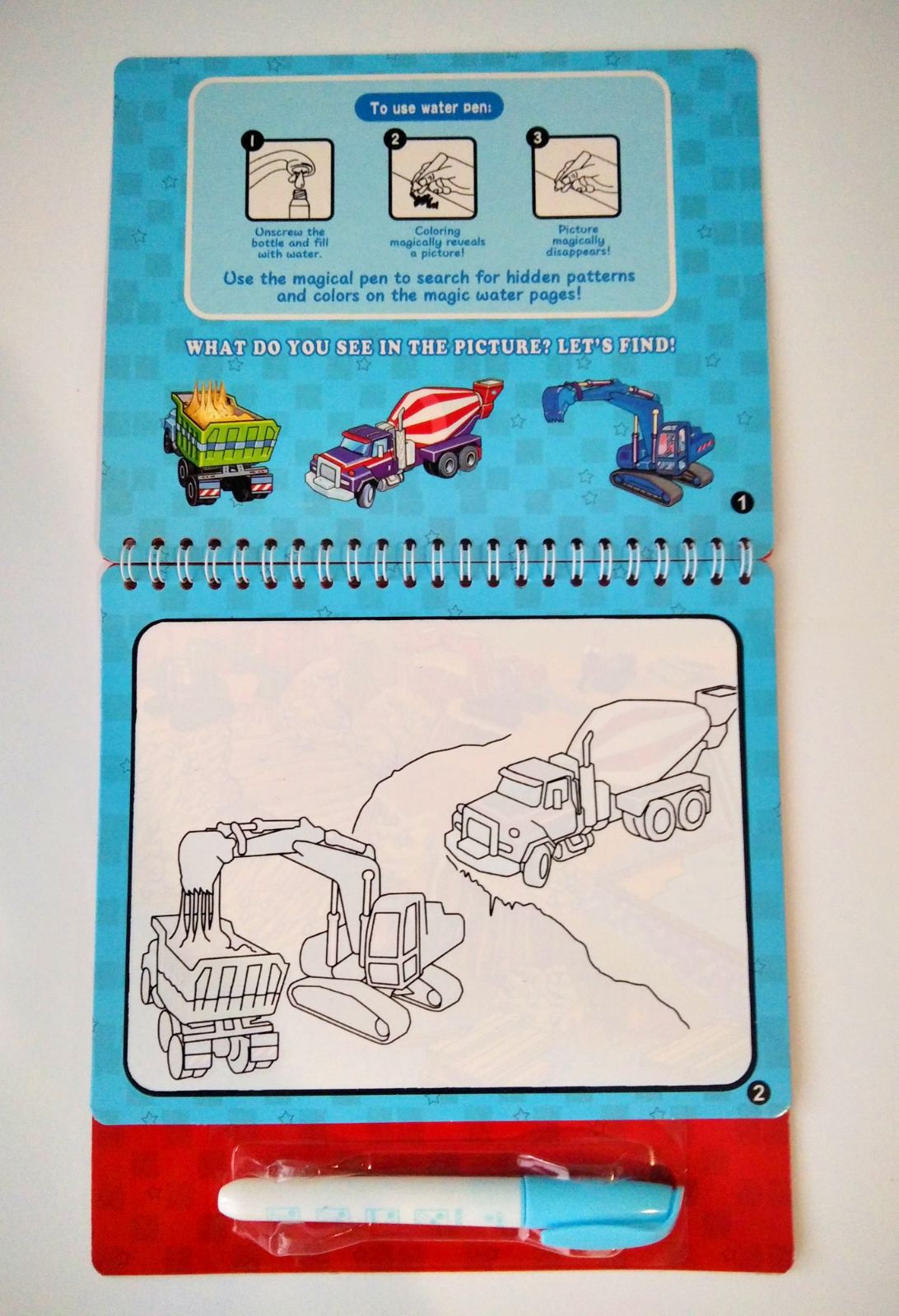 В комплект входит непосредственно водная раскраска и специальный маркер, в который необходимо заливать воду. Когда ребенок начнет раскрашивать черно-белые картинки — будут проявляться цветные изображения. Процесс способствует развитию мелкой моторики рук и координации движений, а также фантазии.