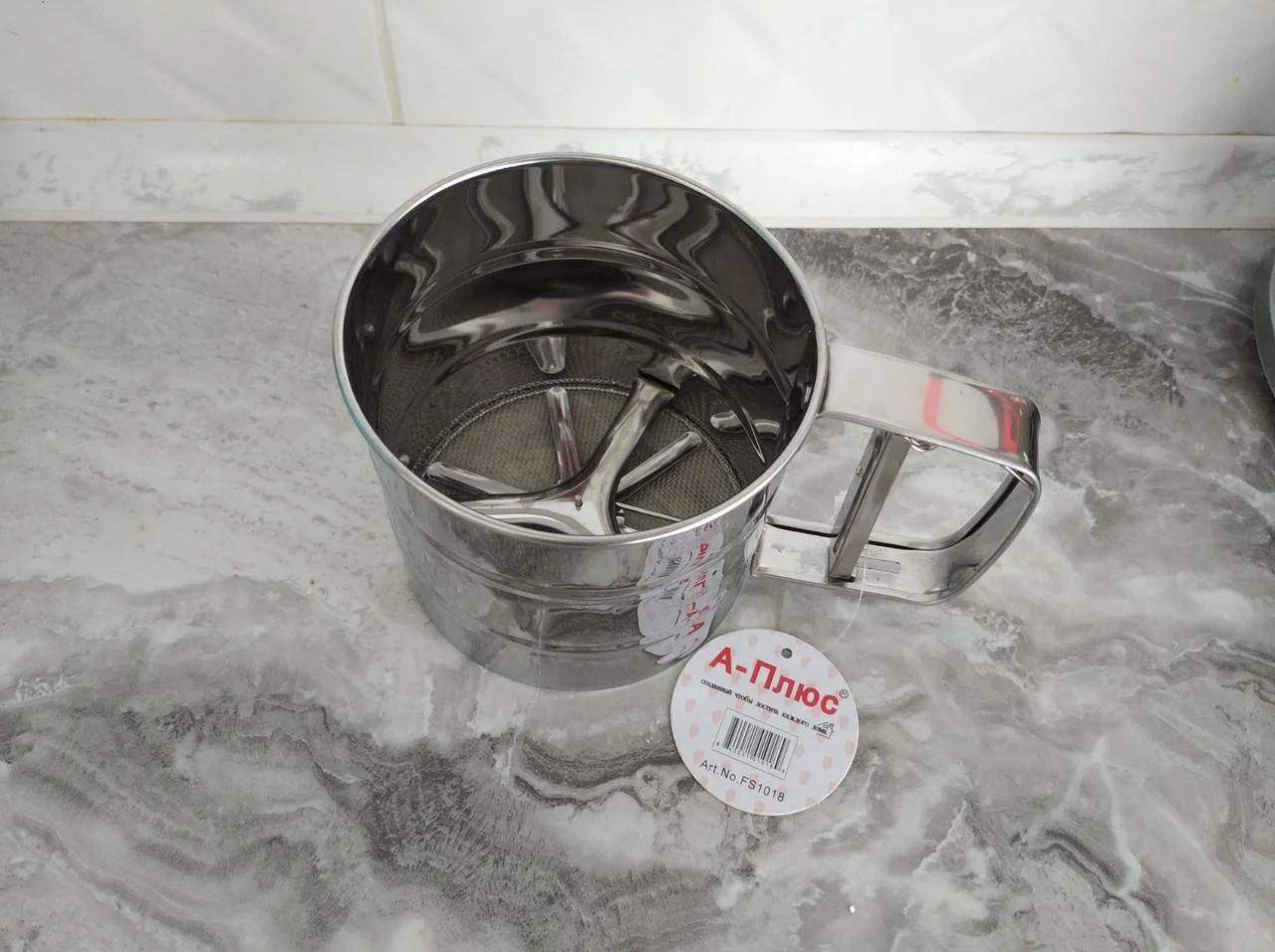 Подходит для просеивания муки, крахмала, какао и прочих сыпучих продуктов. Просто насыпаете муку в чашку, нажимаете на рычаг, и мука сыпется в нужную ёмкость!