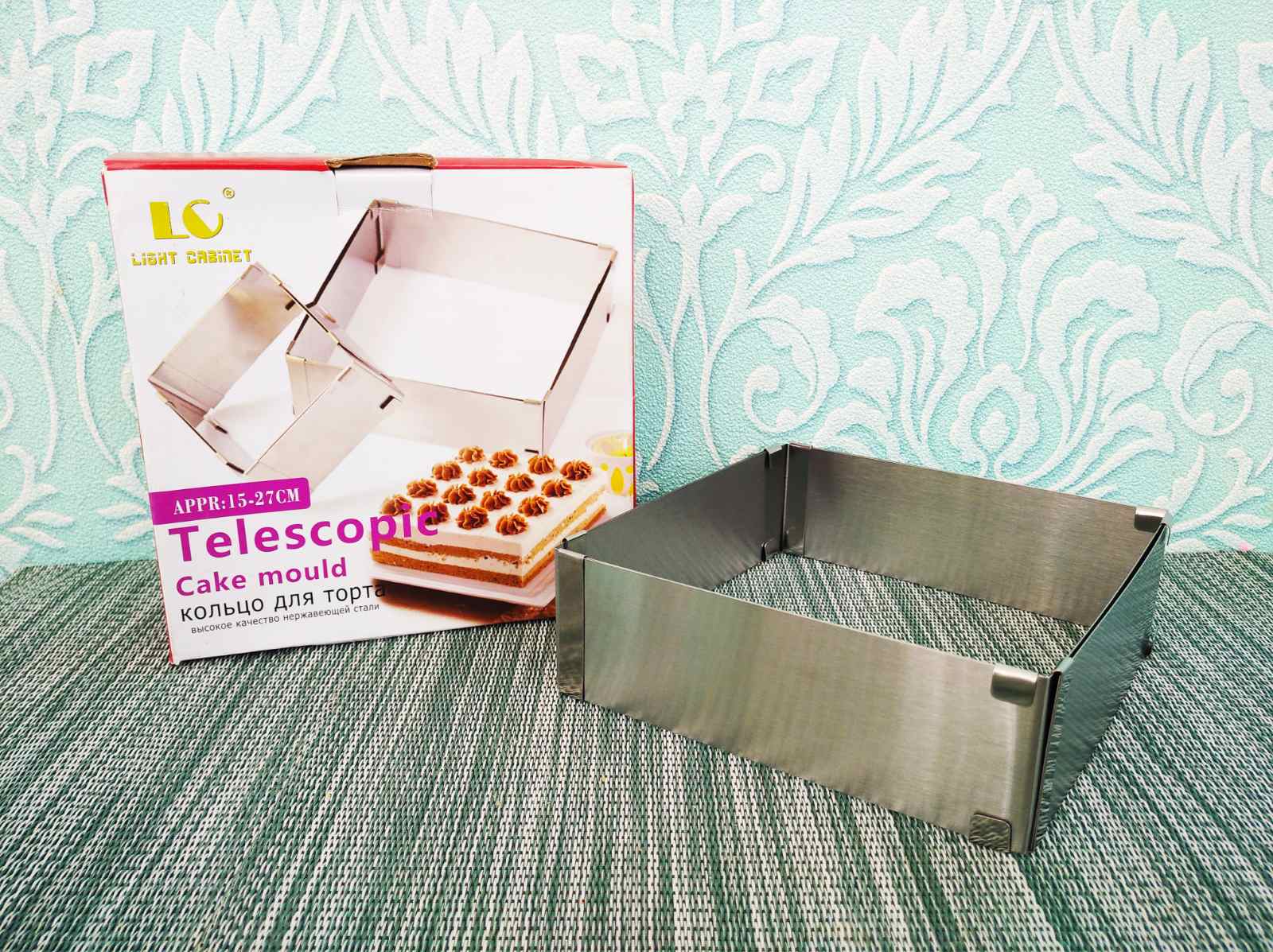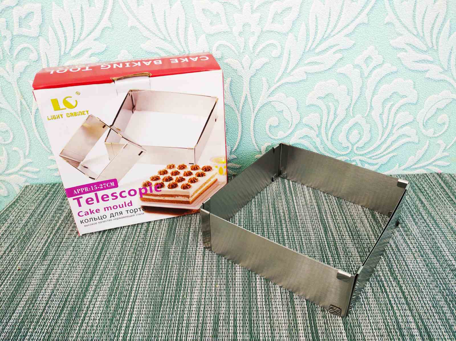 Квадратная раздвижная форма для тортов, размер можно изменять от 15 до 27см. Удобно для приготовления многослойных тортов, заливки желе и суфле. А также для приготовления многослойных салатов и гарниров.