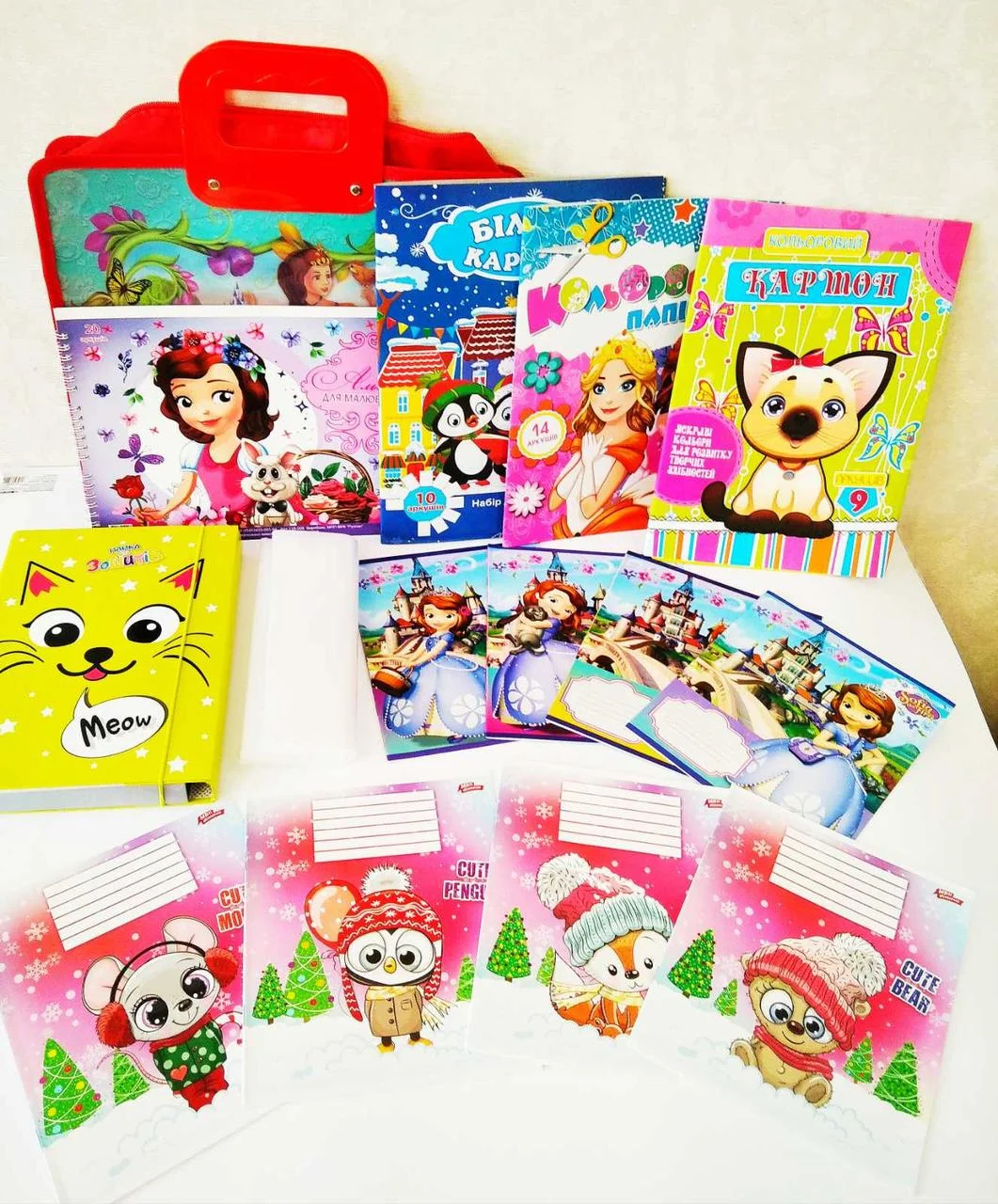 Зверніть увагу!!! Набір підбирається індивідуально під хлопчиків та дівчаток. Для дівчаток ми комплектуємо зошити із тваринками, феями, принцесами і т.д. Для хлопчиків - комплектація на тему спорт, машини, техніка і т.д. Тобто колір та тематика обладинок може відрізнятися від тих, що зображені на фото. На якість та ціну набору це не впливає!