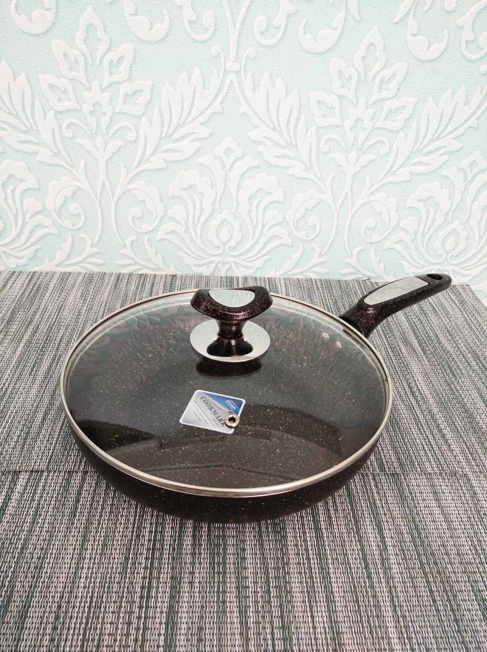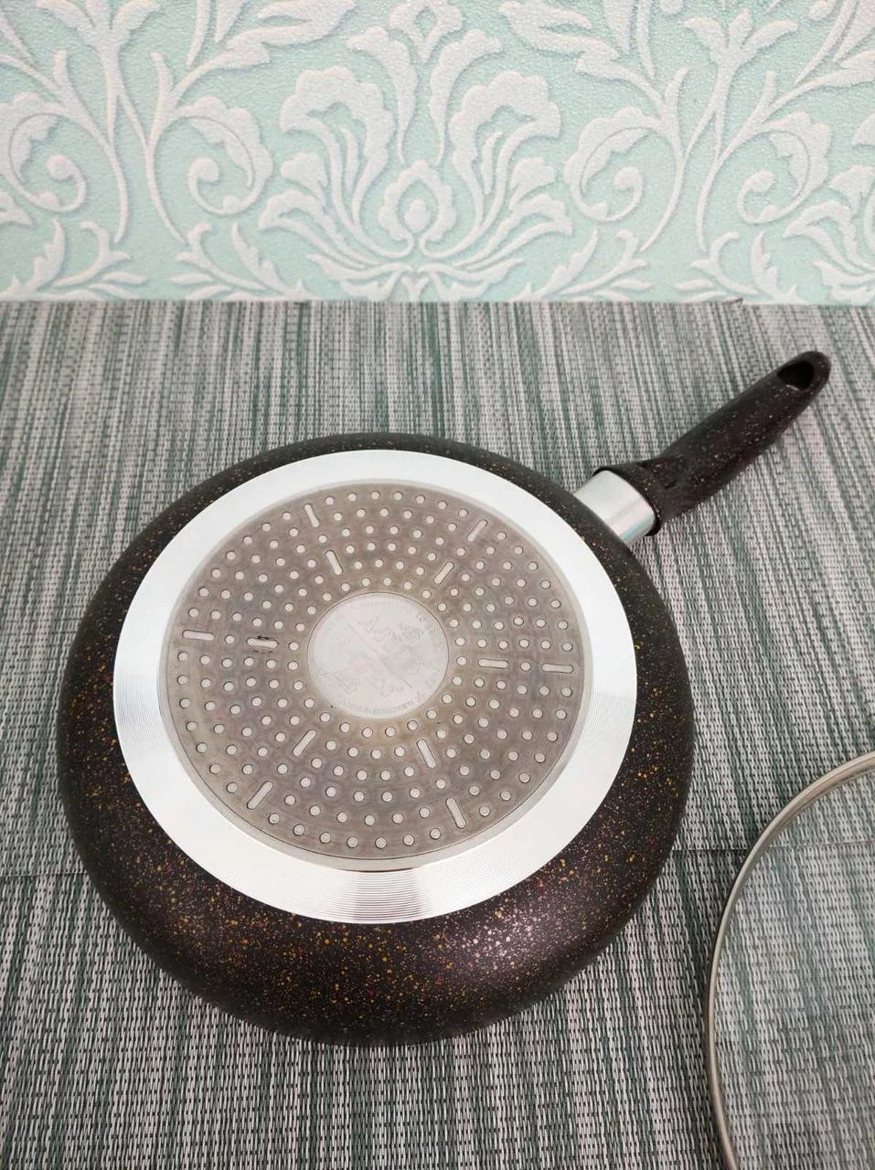 Сковорода с мраморным покрытием в диаметре 24 см, удобна в использовании за счет покрытия позволяющего жарить без всяких проблем, с минимальным количеством масла или вовсе без него.